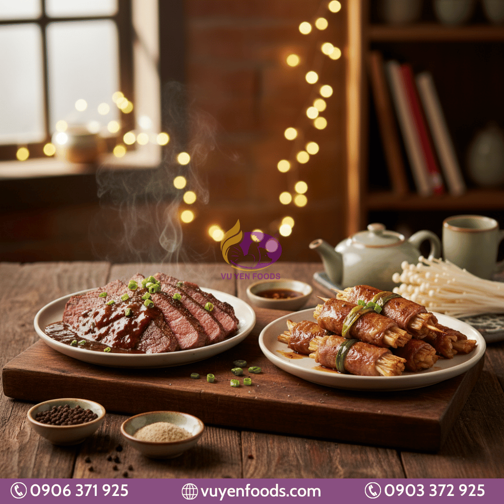 Bò sốt tiêu đen, Bò cuộn nấm kim châm, Bò xào thập cẩm, Bò kho