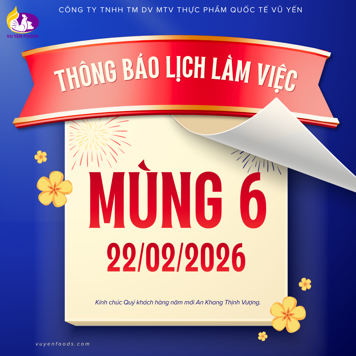 Công ty TNHH TM DV MTV Thực Phẩm Quốc Tế Vũ Yến xin trân trọng thông báo đến Quý Khách hàng và Quý Đối tác lịch nghỉ Tết Nguyên Đán 2026 như sau: